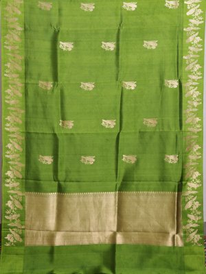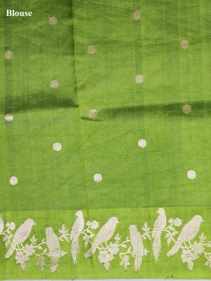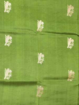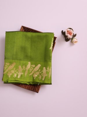 This elegant Mashru Silk Saree features a deep Mehendi green base adorned with sparkling parrot and floral-leaf zari motifs. The satin border highlights exquisite parrot designs alongside refined kamalam kodi work. The pallu captivates with intricate Banaras zari, muthu, moggu, and solid patterning, making it a perfect blend of tradition and style.