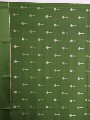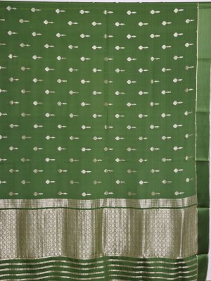 This beautiful Mehendi Green Mysore Silk Saree is a celebration of heritage and elegance. The rich green body is enhanced with intricate zari kamalam buttas that radiate festive brilliance. The border showcases delicate muthu, graceful vanki, and round butta accents along the edge. A solid-pattern zari pallu brings depth and grandeur to the overall drape.