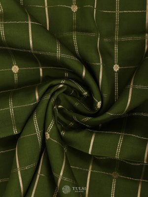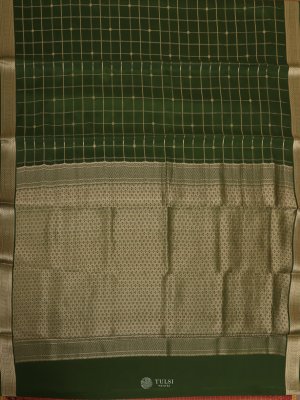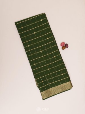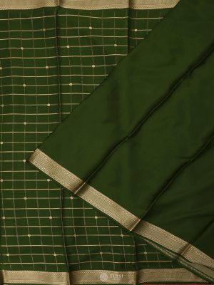 This Mehndi Green Mysore Silk Saree stands out with its rich, lustrous drape and classic charm. The body features a refined checkered pattern woven in subtle gold zari, giving it a graceful, understated sparkle. A sleek zari border frames the saree with traditional motifs, while the pallu showcases intricate golden weaving that adds depth and heritage appeal. Soft, lightweight, and exquisitely finished, this saree blends simplicity with sophistication—perfect for those who appreciate timeless Mysore silk elegance.