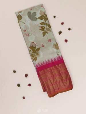 This Mint Green Eco Print Gadwal Silk Saree exudes understated elegance with its soothing pastel body and beautifully detailed eco-printed leaf motifs. The saree showcases traditional Gadwal weaving that adds a touch of heritage charm while keeping the drape light, soft, and comfortable. Its harmonious blend of natural prints and intricate craftsmanship makes it perfect for festive celebrations, cultural functions, and graceful daytime occasions.