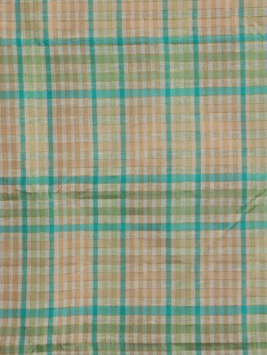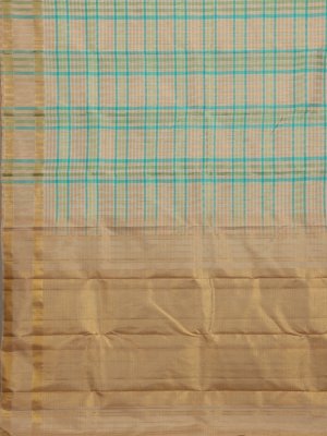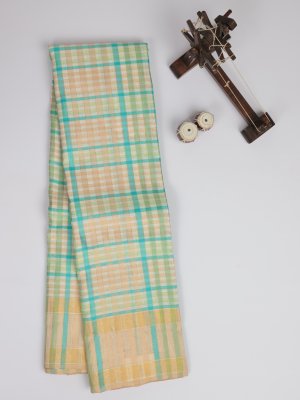 This Kanjeevaram Linen Saree with multi- colour checks brings effortless elegance to your wardrobe. It is enhanced with fine zari detailing that adds a gentle, shimmering touch. The combination of pista green, off-white, light blue and beige checks creates a soft and refined aesthetic. Made from high-quality linen, it offers a comfortable fit with a graceful fall. Perfect for festive celebrations or formal gatherings, it beautifully balances tradition and modern style.
