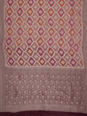 This multicolor Banaras Georgette Silk Saree features a rich mix of geometric floral motifs in vibrant pinks, reds, and lilacs. The deep plum border and pallu are intricately woven with traditional floral zari. A bold and elegant drape for grand celebrations.