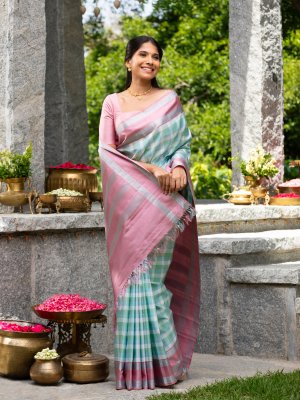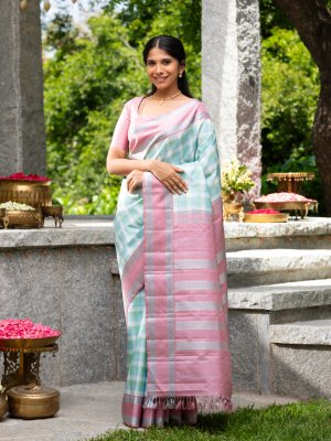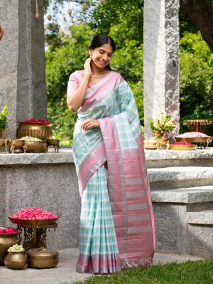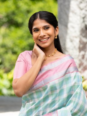 This Elegant Multi Color-Checked Kanjeevaram Silk Saree features a soothing blend of pastel shades in its body, with soft mint green, sky blue, and ivory checks creating a refreshing look. The saree is beautifully complemented by a lustrous baby pink border and pallu adorned with intricate silver zari work, adding a touch of tradition and grace to its modern palette.