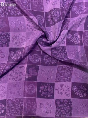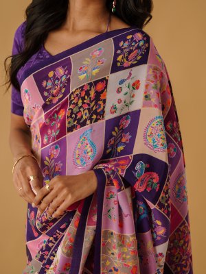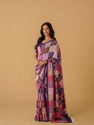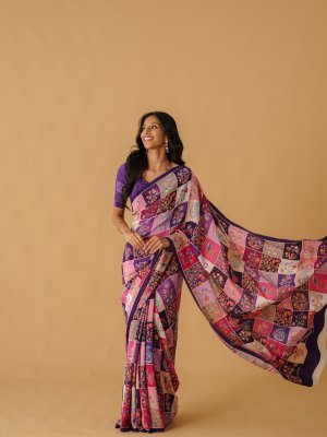 This multi-colored printed crepe silk saree features elegant motifs arranged in a checked pattern with a vibrant and artistic appeal. It is highlighted with beautiful shades of violet, purple, pink, yellow, blue, grey, orange, and white, creating a rich and balanced look. Crafted from lightweight crepe silk, the saree drapes smoothly and is perfect for festive and casual wear.