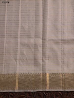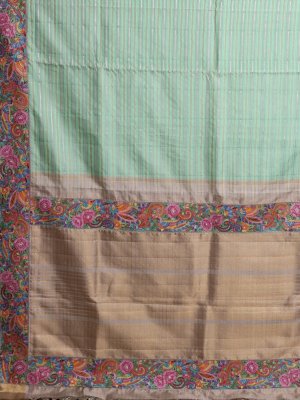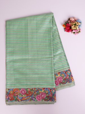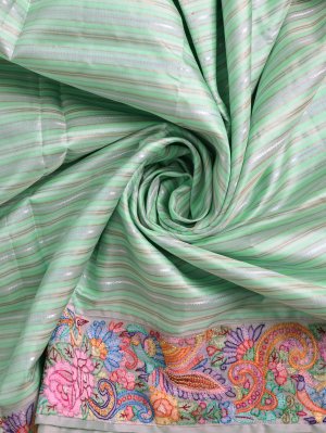 This graceful multi-color striped Kanjeevaram silk saree features soothing shades of green running across the body, beautifully highlighted with fine gold seer and subtle silver veldharai for a soft shimmer. The shadow-embroidered border is the true highlight, adorned with intricate hand embroidery showcasing vibrant floral and paisley motifs in pink, blue, orange, yellow, and green threads, delicately accented with zari detailing. Completing the saree is a rich zari pallu woven with traditional patterns in gold zari, adding a classic Kanjeevaram charm to the contemporary color palette. A perfect blend of elegance, craftsmanship, and festive appeal.