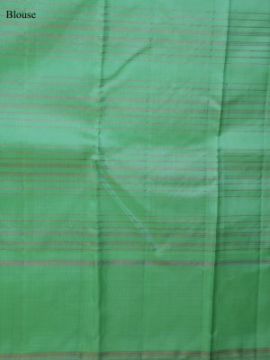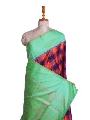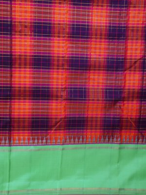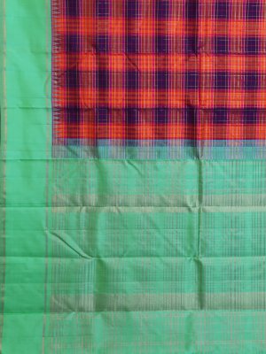 This Multi-colored Kanjeevaram Silk saree features a vibrant body of purple, pink, and orange threads woven into a sophisticated checked pattern. The drape is elegantly framed by a striking Rexona Green bodi border that offers a bold color contrast. Completing the look is a meticulously detailed pallu with traditional Zari stripes and horizontal bands that reflect exquisite South Indian craftsmanship.