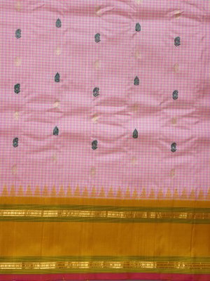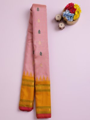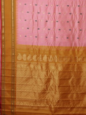 This multi-color checked Gadwal silk saree features a striking mustard yellow border with a radiant gold zari finish. The body is adorned with manga and kamalam buttas, intricately woven using green silk thread and highlighted with gold zari. Delicate pink jamad and jamadpattu accents enhance its artistic charm. A graceful choice that adds regal elegance to your special celebrations.