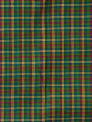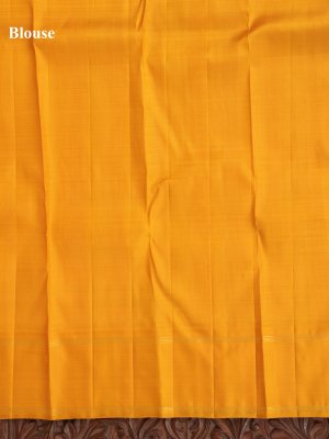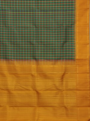 This elegant Kanjeevaram organza saree features vibrant multi-colour checks in blue, magenta pink, light green, and yellow, creating a lively yet graceful look. The sheer organza fabric adds a soft, lightweight drape with a refined finish. A bold contrast mustard yellow border beautifully frames the saree, enhancing its richness. Traditional Pillaiyar temple motifs woven along the border add a timeless cultural touch. Accented with intricate zari work, this saree is perfect for festive and special occasions.