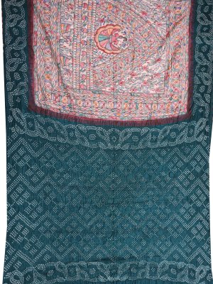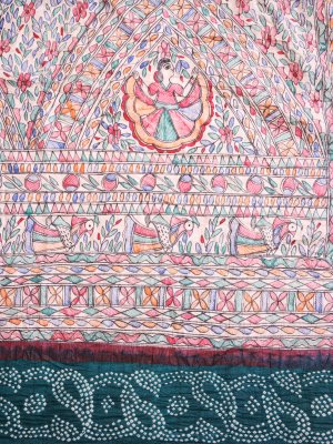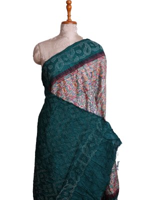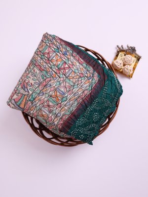 This elegant tussar silk saree features a cream base adorned with vibrant Madhubani-inspired patterns in blue, green, red, orange, and black, creating a lively and artistic look. The contrast dark teal border with subtle Bandhini effects adds a sophisticated touch, while the pallu and blouse carry matching dark teal Bandhini designs for a harmonious ensemble. Lightweight and graceful, this saree is perfect for festive occasions or cultural celebrations.