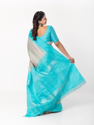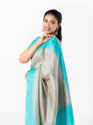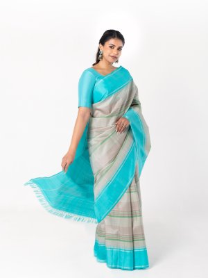 This handwoven Kanjeevaram silk saree has stripes in green & brown shades. It is paired with a teal blue border, adding a lively and striking element to its traditional appeal. The rich combination of colors and intricate design makes it a perfect choice for festive occasions.