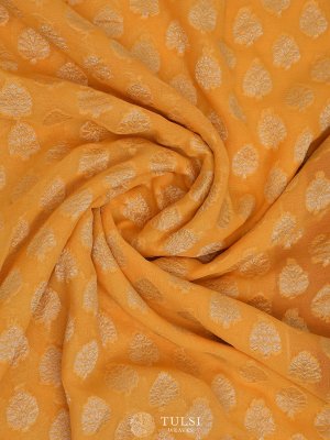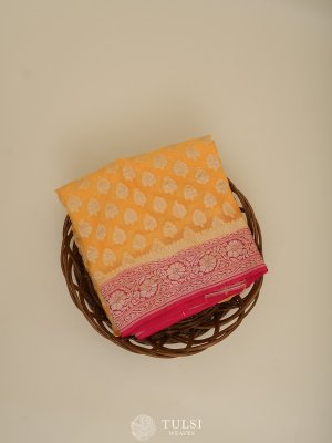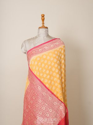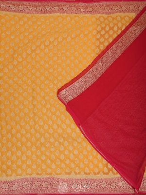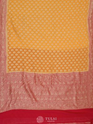 This mustard Banaras georgette silk saree is adorned with zari butis on the body, adding a subtle elegance. The red border creates a striking contrast, enhancing its vibrant and regal appeal.