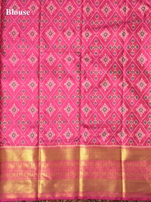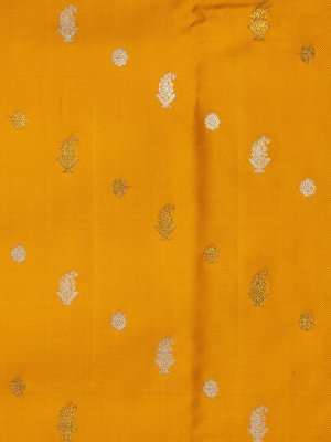 This elegant saree features a rich mustard body adorned with a subtle twill weave and intricately placed gold and silver buttas that add a refined shimmer. The contrasting rani pink border stands out beautifully with detailed peacock motifs and flowing wavy twill design patterns, creating a striking traditional appeal. Paired with a contrast blouse showcasing vibrant multicolor ikat dyeing patterns, the ensemble blends classic artistry with contemporary charm.