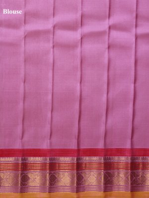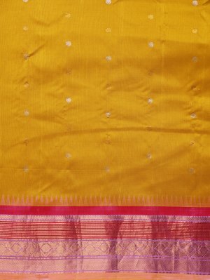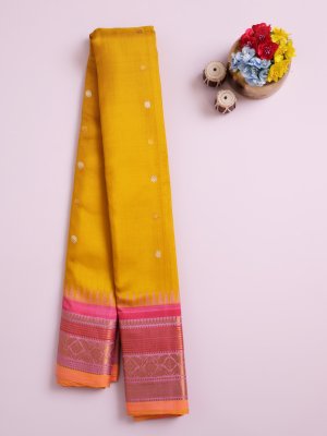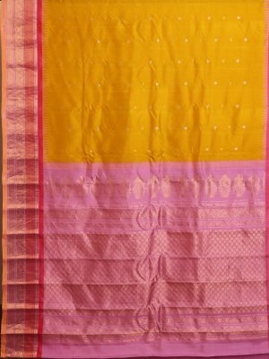 Elegant and vibrant, this Gadwal Silk Saree in mustard yellow is embellished with shimmering gold and silver kamalam buttas. The striking pink border features detailed kodi, banaras, muthu, and moggu motifs, enriched with Pillaiyar temple designs, reddish-pink astri, and yellow jamadu highlights. The pallu captivates with geometric motifs paired with kamalam, kodi, banaras, muthu, and moggu patterns, offering a regal and festive look.