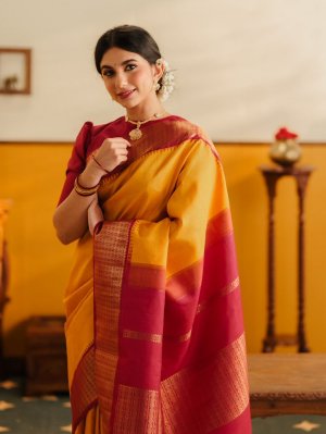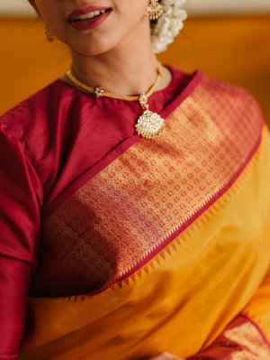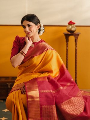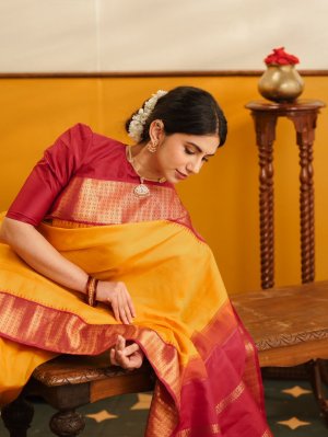 This Mustard Yellow Kanjeevaram Silk Saree with an Araku border exudes a graceful vintage charm reminiscent of timeless South Indian elegance. The rich mustard yellow body radiates a warm, golden glow, beautifully contrasted by the deep Araku maroon border that adds a regal touch. Finely woven in pure silk, the saree showcases subtle traditional motifs and a lustrous texture that speaks of classic craftsmanship. Perfect for festive occasions and traditional celebrations, this saree embodies the essence of old-style Kanjeevaram artistry with an enduring, heritage appeal.