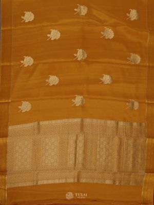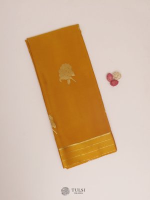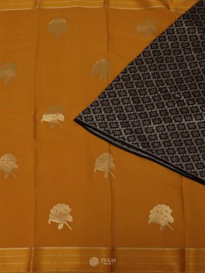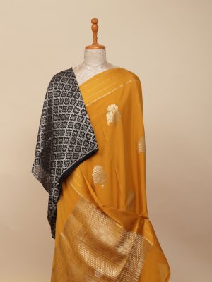This Mustard Yellow Mysore Silk Saree is a true classic with its lustrous finish and graceful drape. The rich golden zari motifs and border enhance its regal appeal, while the contrasting Banaras Georgette blouse in black with intricate weaving adds a touch of contemporary sophistication.