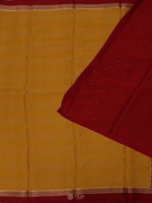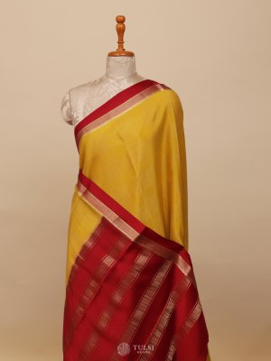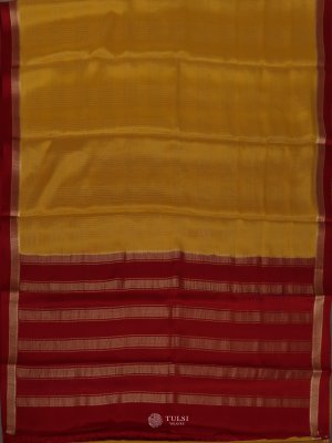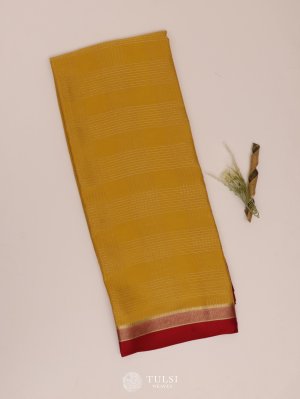 This Mustard Yellow Mysore Silk Saree with a Red Border radiates timeless elegance and charm. The saree features fine woven lines across the body, adding subtle texture and visual interest to its smooth silk fabric. The soothing Mustard Yellow body is beautifully complemented by the refined Red border highlighted with intricate zari detailing.