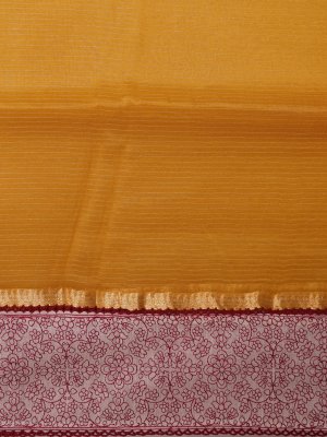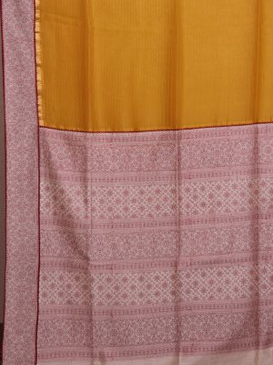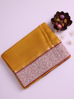 This mustard yellow silk saree offers a light and elegant appeal. The border and pallu are crafted from beige tussar silk, beautifully embroidered with maroon thread in intricate chain stitch work. Lace detailing joins the border and pallu to the body, while the edges are enhanced with delicate lace work. It brings a graceful and timeless charm to every moment.