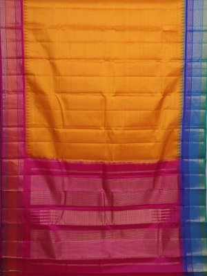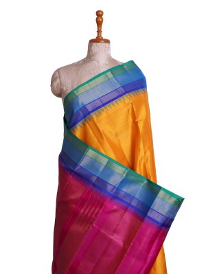 Mustard Yellow Soft Silk Saree with Rani Pink and Peacock Blue Ganga Jamuna Border