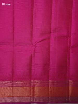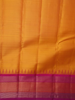 This Mustard Yellow Soft Silk saree flows with a gentle, smooth drape across its body, paired with a striking dual-toned Ganga Jamuna border in Rani pink and peacock blue. The contrasting borders are defined by sharp triangular temple patterns and metallic zari bands that flow into a rich pink pallu adorned with dense geometric zari work. Complete with a running pink blouse, the ensemble settles with effortless grace, making it a vibrant choice for grand celebrations and cultural events.