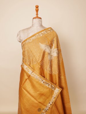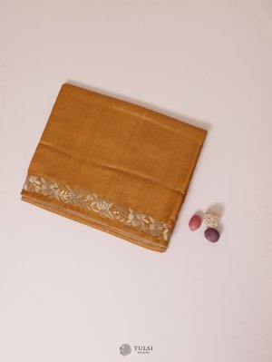 Mustard Yellow Tussar Silk Saree with Floral Embroidery Border