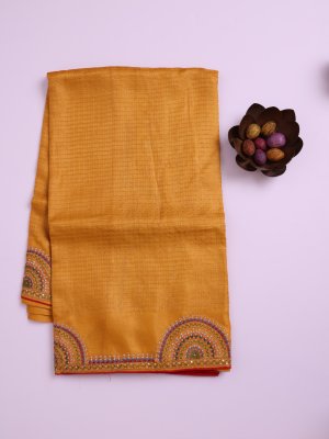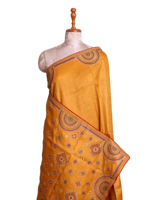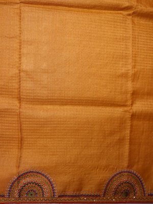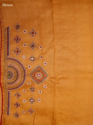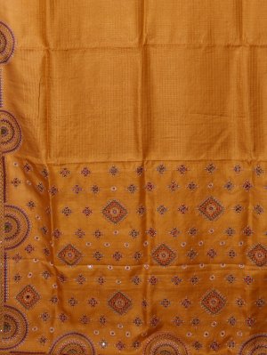 This Mustard Yellow Tussar Silk saree reveals a radiant glow through its fine zari checked weave. The pallu and borders are heavily decorated with multi-colored Kutch embroidery, where greyish blue, red, and green threads intertwine with cream accents and shimmering mirror work. A distinct red piped finishing defines the edges of the drape, matched by a blouse that carries a coordinated embroidery patch for a polished ethnic silhouette.