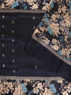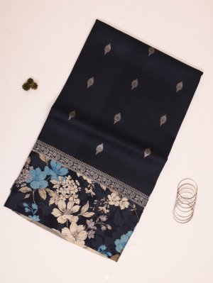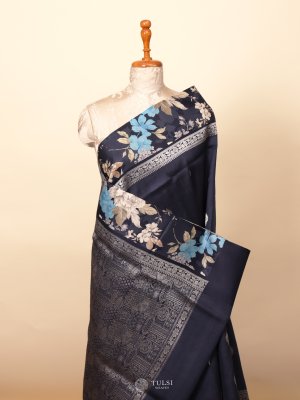 Elegant Navy Blue Printed Tussar Silk Saree featuring a beautifully printed floral border. Lightweight, breathable, and perfect for both casual elegance and festive occasions.