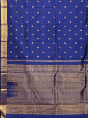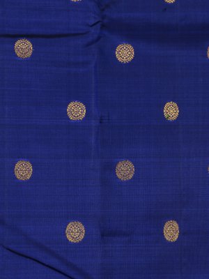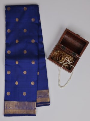 Embrace elegance with this Navy Blue Kanjeevaram silk saree, where tradition meets opulence. The body is adorned with delicate kamalam zari buttas, shimmering subtly against the rich silk. While this pallu dazzles with finely crafted seppu rekku and majestic peacock, elephant, and kamalam motifs. Every weave speaks of heritage craftsmanship and meticulous artistry. Perfect for weddings, festive celebrations, or grand occasions, this saree promises to make every moment memorable.