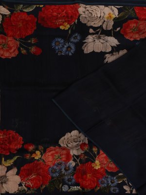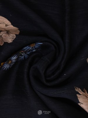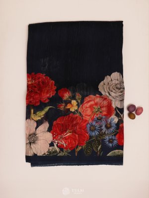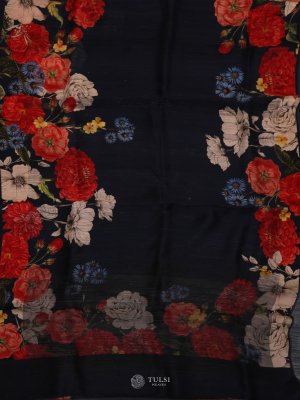 This Navy Blue Matka Tussar Silk Saree features a beautifully soft, textured drape enhanced with delicate floral prints along the borders. Its subtle sheen and lightweight feel make it perfect for both festive and formal occasions. The refined colour palette adds timeless charm, making it a versatile addition to any wardrobe. A sophisticated blend of tradition and contemporary style.