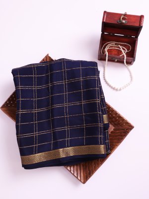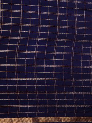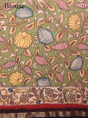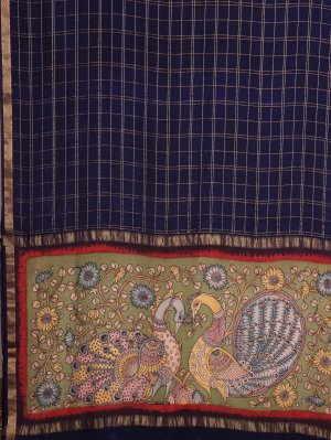 The saree has a navy blue body with golden Banarasi zari checks that add a rich shine. Its pallu features beautiful Kalamkari hand-painted peacocks and floral designs in soft colors. The matching Kalamkari blouse complements the pallu with similar traditional patterns. This saree perfectly blends the sparkle of Banarasi zari with the art of Kalamkari for special occasions.