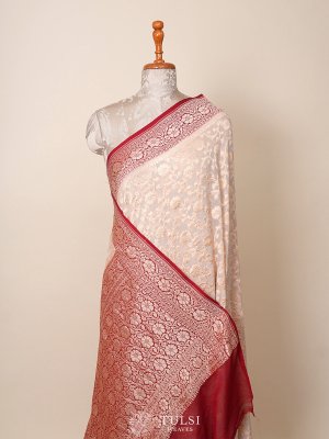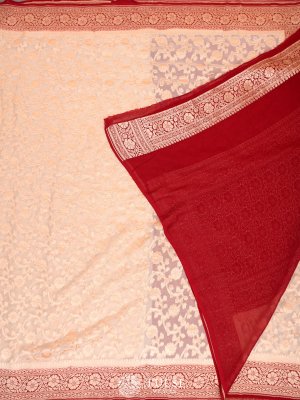 This off-white Banaras georgette silk saree is adorned with delicate zari designs on the body, exuding understated elegance. The vibrant red border adds a bold contrast, enhancing its timeless beauty.