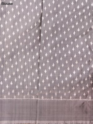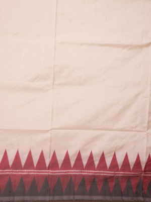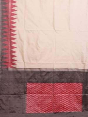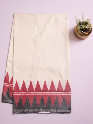 This off-white Ikat silk saree features a luminous, clean base that allows the premium silk's natural sheen to take center stage. Its elegance is defined by the striking "Reverence" temple pattern at the border, where rhythmic black and red motifs create a bold, architectural frame. This sharp contrast between the ivory canvas and the vibrant motifs provides a statuesque and sophisticated silhouette for the wearer.