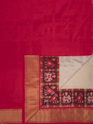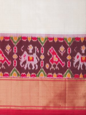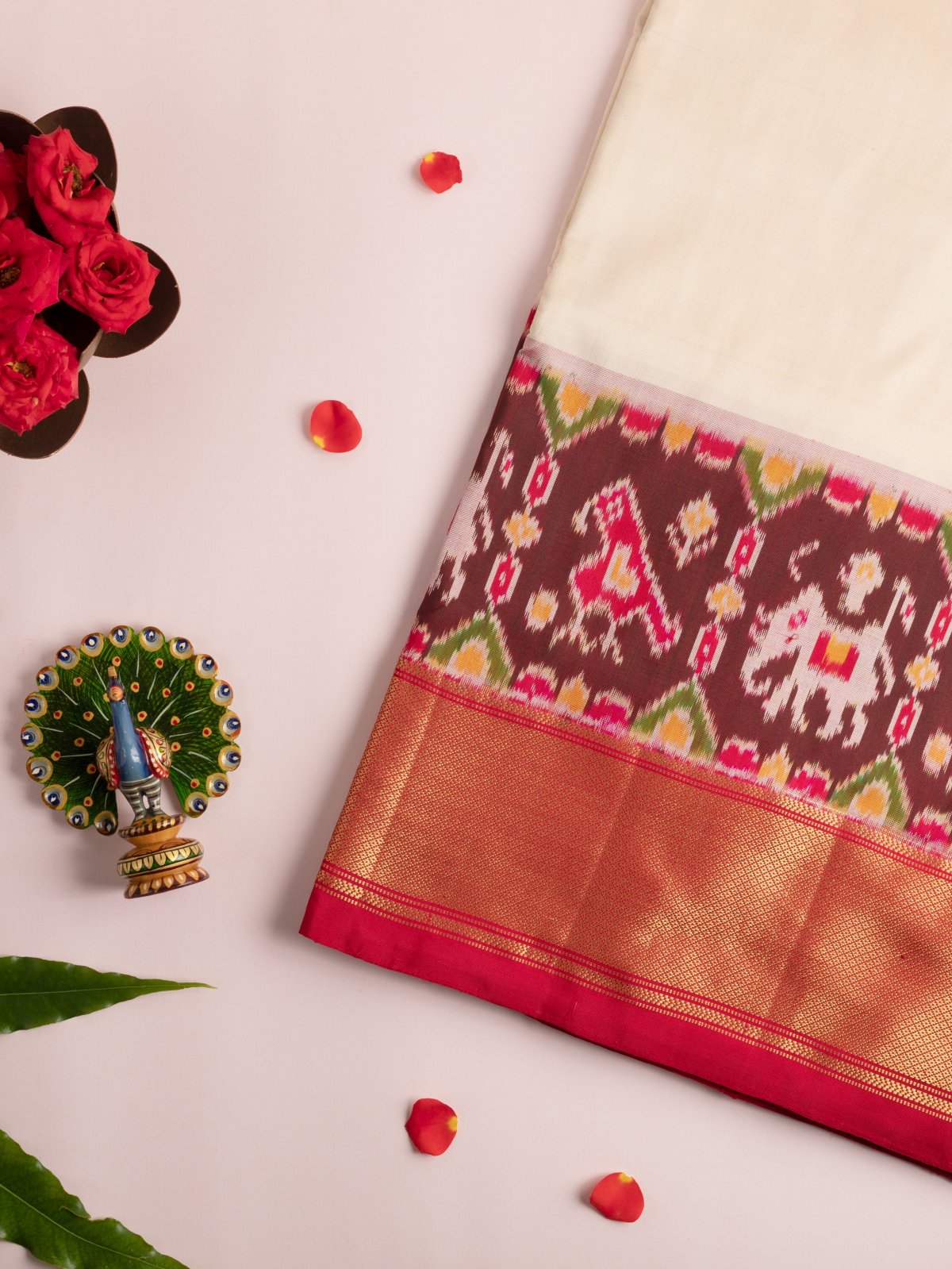 This handwoven off-white ikat silk saree is paired elegantly with red border that has gold zari detailing. Elephant and bird ikat motifs can be found running along the border.