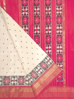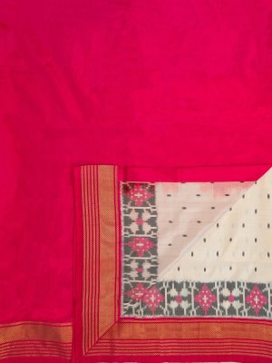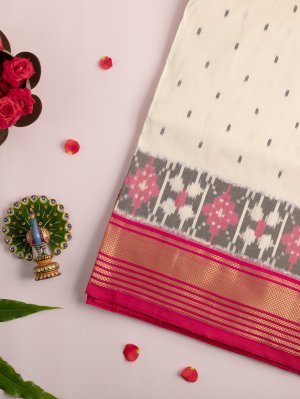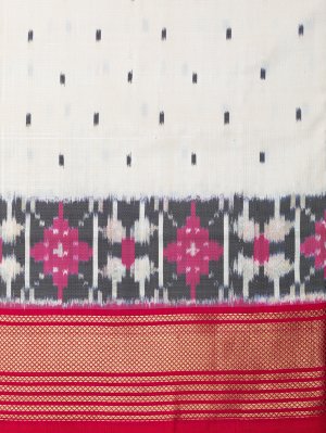 This handwoven ikat silk has an off-white body with black butties spread all over. It is paired with a reddish pink border that has gold zari detailing. Floral ikat patterns run along the border.