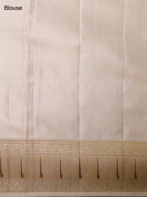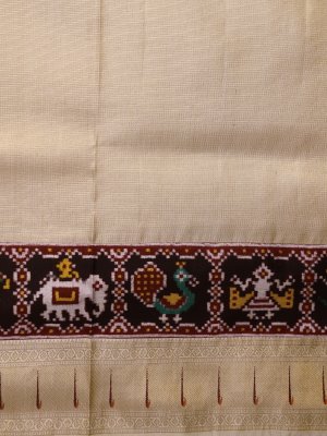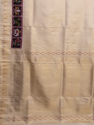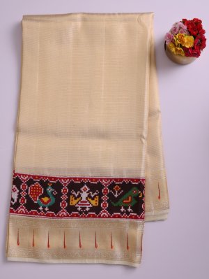 This elegant off-white Kanjeevaram silk saree features a striking Patan Patola border adorned with traditional peacock and elephant motifs in vibrant red, yellow, green, and white. The intricate Meen Thoondil design at the edge adds a refined South Indian touch, beautifully framing the geometric Gujarati artistry against the serene ivory body. This fusion piece radiates a sense of pure, understated luxury, making it a perfect choice for auspicious occasions and heirloom collections.