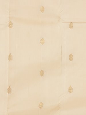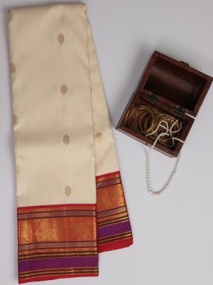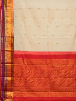 Celebrate in style with this Off White Kanjeevaram silk saree, adorned with shimmering zari buttis on the body. The lively red border features playful elephants and peacocks, highlighted with purple astri, green neli, and temple accents. Its contrasting red pallu sparkles with detailed motifs of elephants, peacocks, and leaves, making it truly festive. Ideal for weddings and joyous occasions, it brings tradition and color together beautifully.