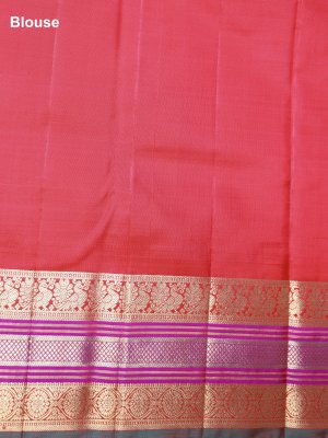 This elegant Kanjeevaram silk saree features an off-white body beautifully adorned with rich gold and silver zari stripe patterns, creating a timeless and graceful appeal. The contrast red Patan Patola–inspired border showcases vibrant hues of green, yellow, brown, and deep red, adding a striking traditional charm. Accentuated with magenta pink and green jamadu detailing, the border enhances the saree’s luxurious craftsmanship. Paired with a contrast red blouse, this ensemble exudes classic sophistication perfect for festive and special occasions.