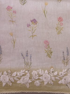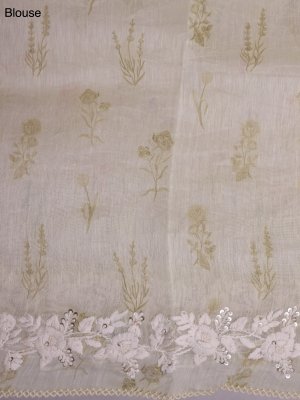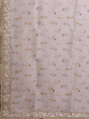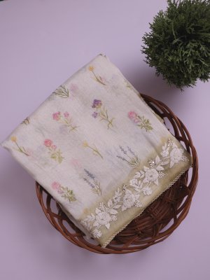This off-white linen saree features gentle floral motifs scattered across its body, creating a serene and understated look. Its light mehndi embroidered border adds a distinctive, earthy accent that enhances the overall design. The breathable fabric ensures comfort, making it suitable for both everyday wear and special occasions.
