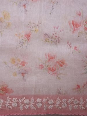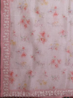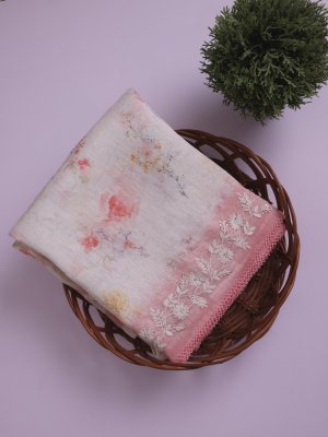 This elegant off-white linen saree features a soft, breathable texture with delicate floral prints across the body, adding a graceful, feminine charm. The peachy pink embroidered border with intricate detailing enhances its appeal, making it perfect for any occasion.