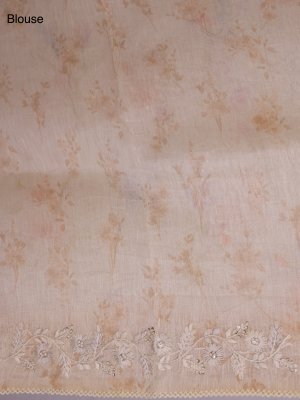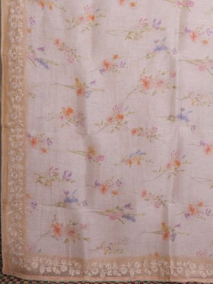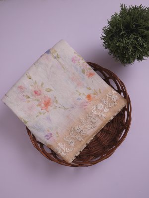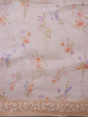This off-white linen, this saree is adorned with scattered floral prints in soft, refreshing hues. The design brings a light, breezy feel that is both subtle and visually appealing. A finely detailed Sandal embroidered border adds warmth and definition to the look. Ideal for effortless styling, it suits both casual and semi-formal occasions