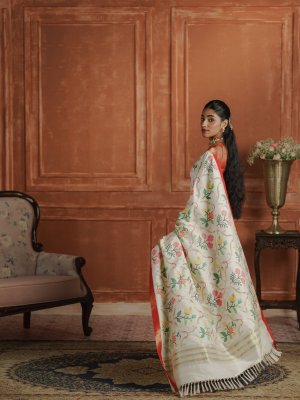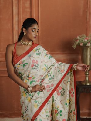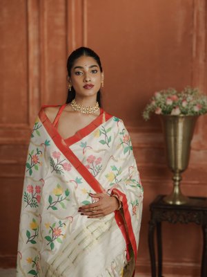 This off-white Paithani saree showcases a graceful body highlighted with vibrant floral and vine motifs woven in rich, lively hues. The striking red contrast border adds a bold traditional finish, perfectly framing the elegance of the drape. Crafted with classic Paithani artistry, the saree reflects timeless charm and refined craftsmanship. Ideal for festive occasions, cultural celebrations, and elegant daytime events, this saree blends heritage with effortless sophistication.