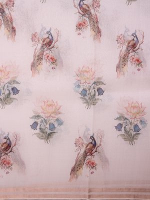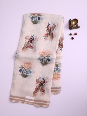 This Off White Organza Silk Saree features a luminous, weightless body beautifully detailed with classic peacock and blooming lotus prints. The drape concludes in an elaborate linen finished Jamdani pallu with floral motifs and a playful bird design, finished with a rustic tassel edge. Its accompanying blouse is transformed by vibrant, multi-tonal stripes that catch the light, perfect for festive ceremonies and celebrations.
