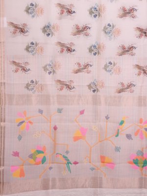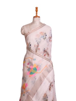 Off White Printed Organza Silk Saree with Jamdani Pallu