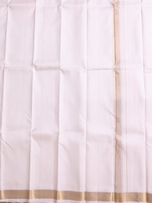 This off-white silk dhoti and vasthram set is simple, elegant, and traditional. The soft silk fabric has a smooth feel and a gentle shine, making it look rich and graceful. It features a neat gold zari border that adds a touch of beauty without being too heavy. Perfect for weddings, poojas, and special occasions, this set is comfortable to wear and gives a classic South Indian look.