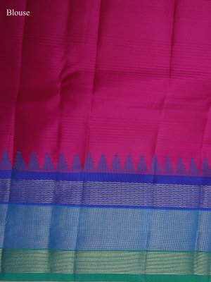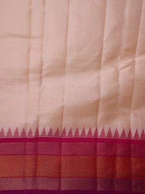 This Off- White Soft Silk Saree flows with a lustrous, creamy texture across the body, featuring subtle horizontal weave lines for a rich feel. The dual-toned Ganga Jamuna border combines vibrant rani pink and deep peacock Blue, anchored by sharp metallic temple patterns and shimmering zari bands. A bold rani pink pallu delivers a grand finish, showcasing intricate zari stripes and geometric accents that glow prefect for grand celebrations.