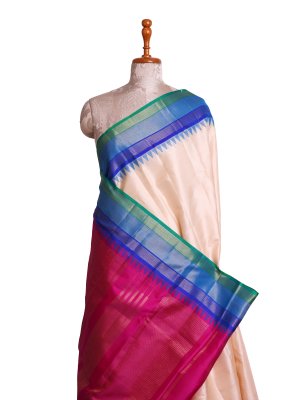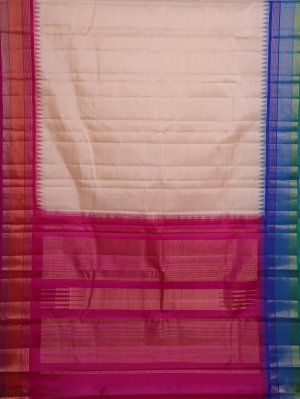 Off- White Soft Silk Saree with Rani Pink and Peacock Blue Ganga Jamuna Border