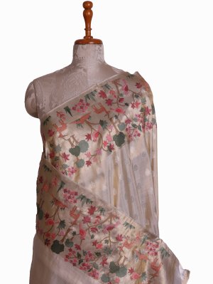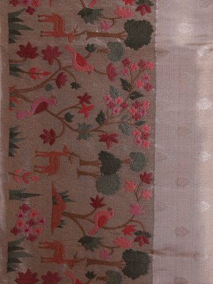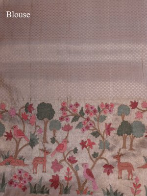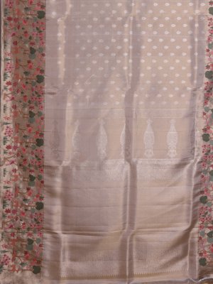 This beautiful Off-White Tissue Silk Saree has a rich, metallic shine that glows like a pearl. The body is decorated with tiny silver woven dots, while the bottom features a grand, shimmering silver border. The highlight is the thick embroidery on the edges, showing a pretty garden of colorful trees, flowers, and deer. It is a very royal and elegant saree, perfect for making a stylish statement at weddings or big celebrations.