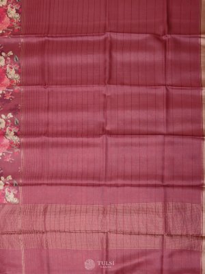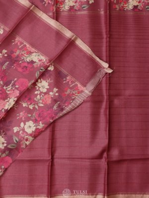 This Onion Pink Tussar Silk Saree stands out with its beautifully detailed floral prints that flow gracefully across the border. The natural texture of Tussar silk gives it a soft sheen and fluid drape, making it perfect for festive gatherings, cultural events, and elegant daytime occasions.