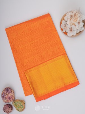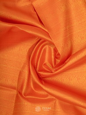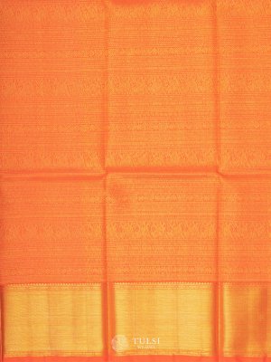 This exquisite Orange Kanjeevaram Silk Blouse showcases luxurious zari brocade work, exuding timeless elegance. Complemented by a self-zari border, this blouse perfectly blends traditional craftsmanship with refined sophistication.