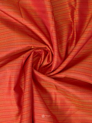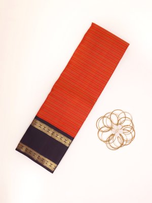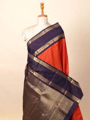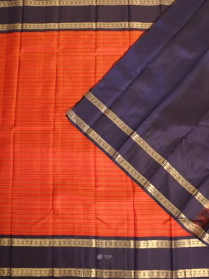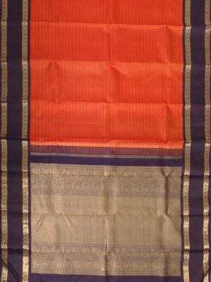 This Orange Kanjeevaram silk saree with a rich Dark Navy Blue contrast border, features traditional woven motifs across the body, and a pallu adorned with classic patterns in vibrant tones.