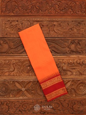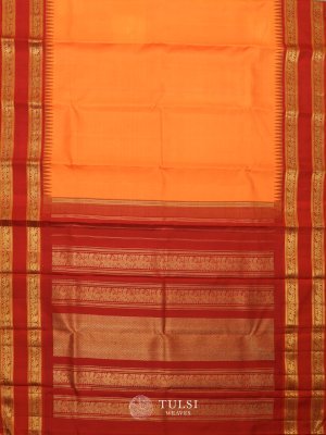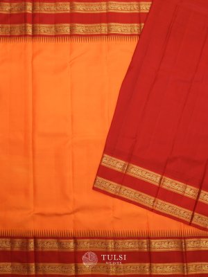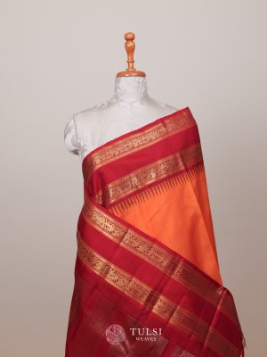 This Orange Kanjeevaram Silk Saree features a vibrant Maroon traditional Rettapet Border. The body is beautifully adorned with intricate gold zari designs, adding a royal touch. Perfect for weddings or festive occasions, it combines elegance and timeless charm.